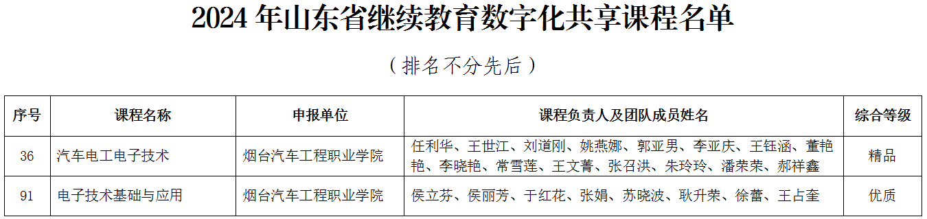 根据《山东省教育厅关于开展 2024年度社区教育优秀课程资源遴选活动的通知》、《山东省教育厅关于开展 2024 年度继续教育数字化共享课程遴选的通知》要求,学院积极组织教师申报。经申报推荐、专家评审和公示,《新能源汽车的维护与保养》、《村播技能提升微课堂》等13门课程被评为2024年度山东省社区教育优秀课程资源,《汽车电工电子技术》被评为2024年山东省继续教育数字化精品课程、《电子技术基础与应用》被评为2024年山东省继续教育数字化优质课程。