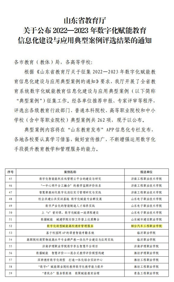 6月20日,437ccm必赢国际《数字化转型赋能高校教育管理服务》获评山东省教育厅 2022—2023年数字化赋能教育信息化建设与应用典型案例,这标志着学院信息化建设成效显著。
